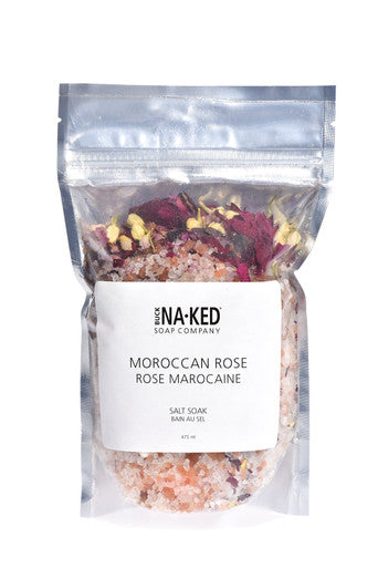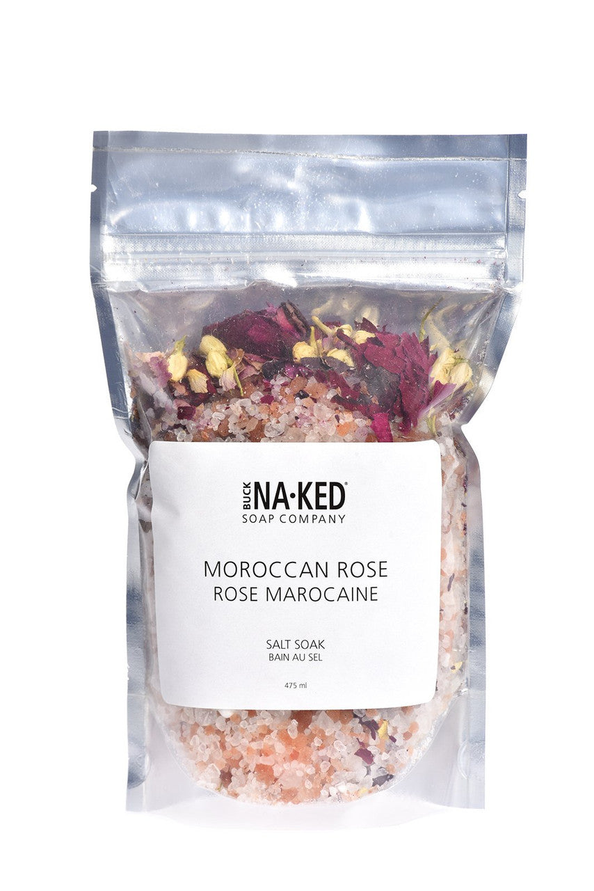 Soft, sweet and steeped with romance. Buck Naked's Moroccan Rose Salt Soak is an exquisite coupling of old world tradition and contemporary elegance. Delicate rose and jasmine buds dance amid a mineral rich Dead Sea and Himalayan salt blend, boosting your bath oasis to new levels. This essential oil enriched bath salt soak has been formulated to help hydrate skin, reduce the appearance of fine lines, and break down toxins under the surface.