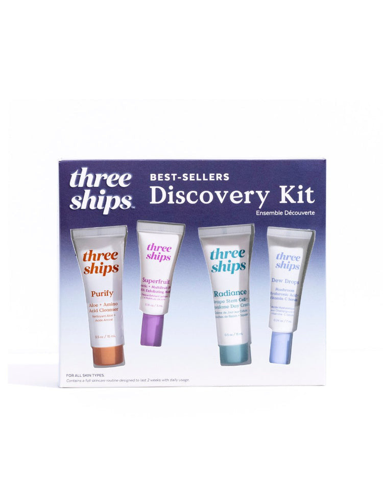 Discover radiant, healthy skin with this curated quartet of Three Ships’ most-loved essentials — now in deluxe mini form. The Best-Sellers Discovery Kit is your two-week introduction to clean, effective skincare powered by natural, plant-based ingredients. Designed for all skin types, this set cleanses, hydrates, exfoliates, and brightens to reveal your most luminous complexion.
