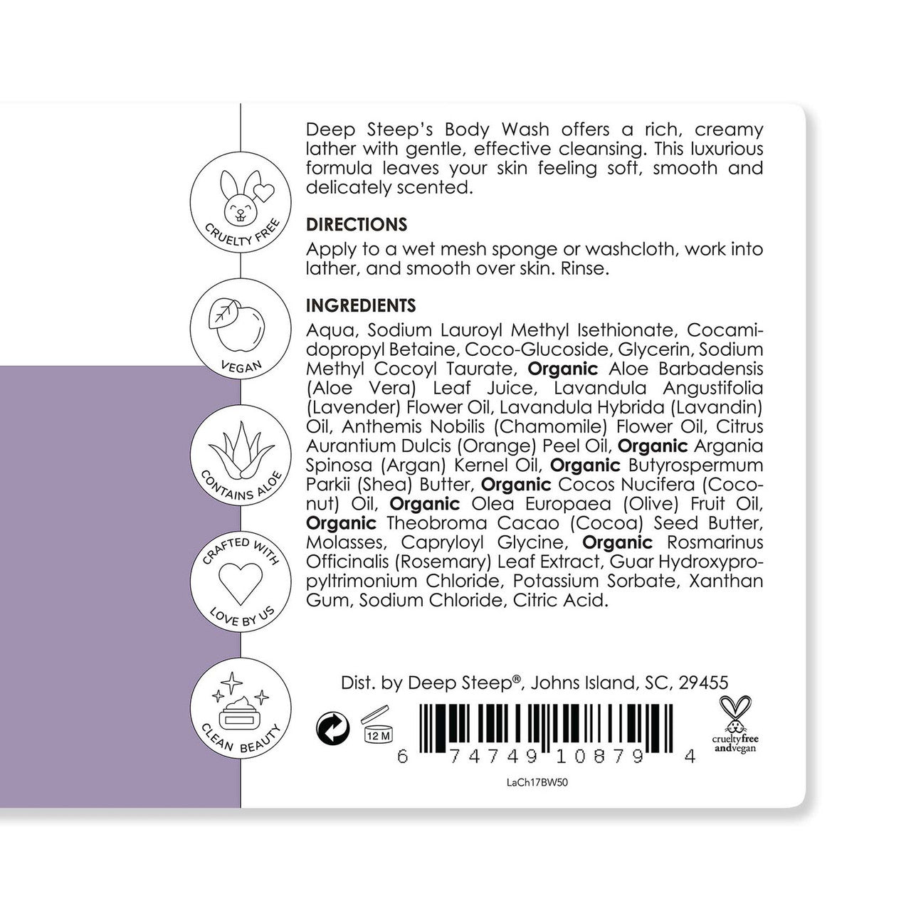 Body Wash from Deep Steep offers rich, creamy lather with gentle, effective cleansing. This luxurious plant-based formula leaves your skin feeling soft, smooth, and delicately scented.