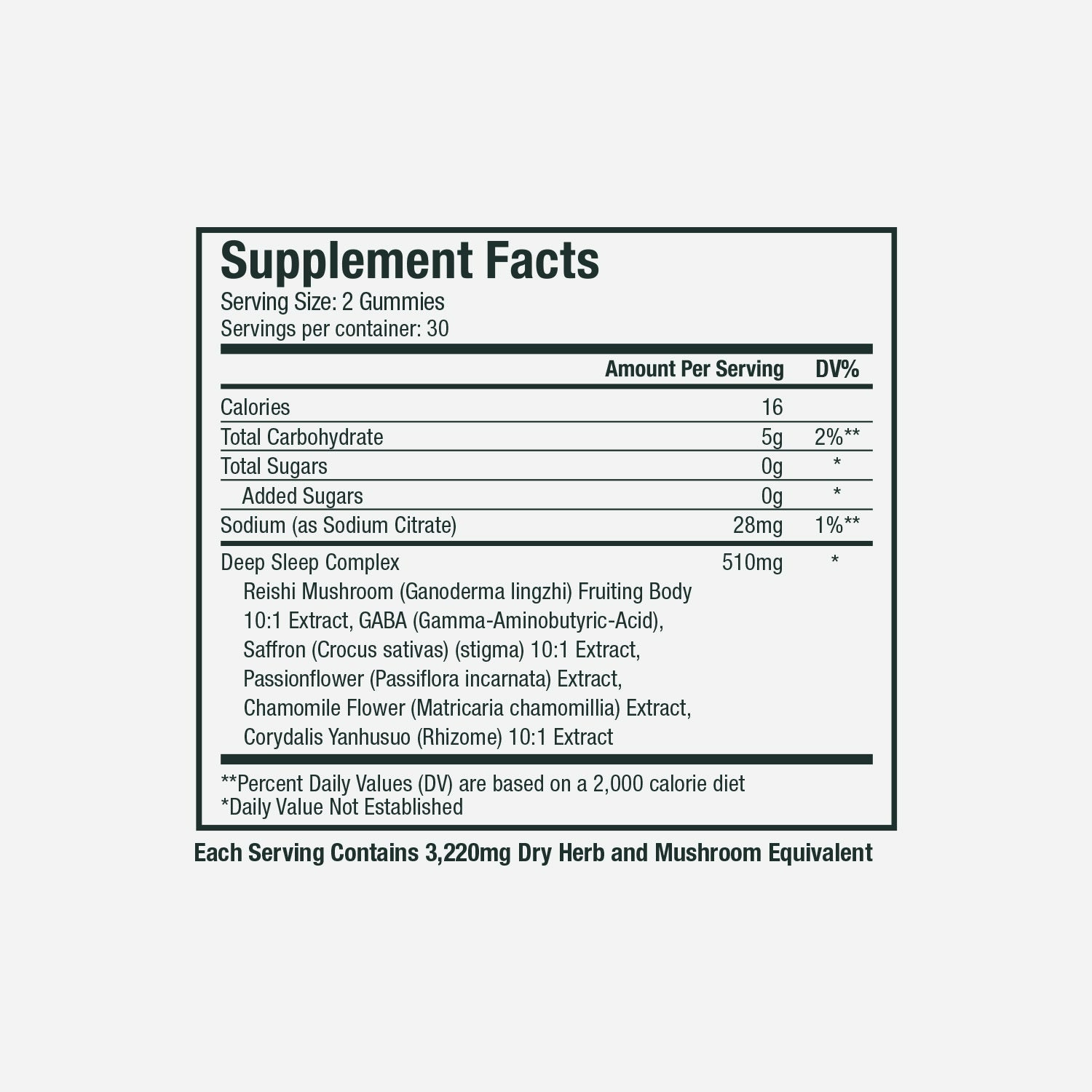 - DEEP SLEEP - Targeted mushroom and botanical extracts help to calm the nervous system, stress response and cortisol allowing our bodies and minds to dive into deeper sleep for more energy the next day.