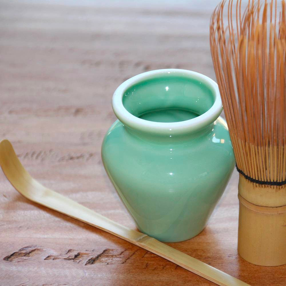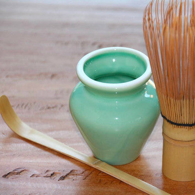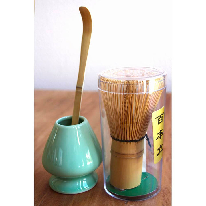 This wonderful set contains everything you need to prepare Matcha at home or at work: a spoon suitable for measuring matcha, the traditional bamboo whisk and a whisk holder that both protects your whisk from damage as well as prevents a dirty countertop.