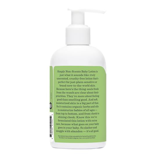 - Simply Non-Scents Baby Lotion is just what it sounds like: truly unscented, cruelty-free lotion that’s perfect for just-plain-sensitive or brand-new-to-the-world skin. Because here’s the thing: souls fresh from the womb are clear about their priorities. They’re more about feeling good than smelling good. And soft, moisturized skin is a big part of that. So it contains organic herbs and oils to moisturize babies of all ages — from top to bottom, and from cheek to shining cheek. Know this: we’ve formulated this lotion with extra care, because much of what goes on your baby goes in your baby. So slather and snuggle with abandon — it’s all good.